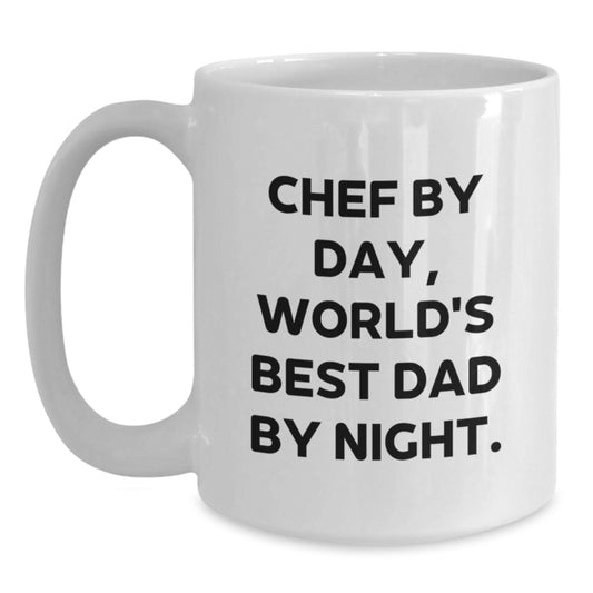 Chef By Day, Funny White Coffee Mug for Chef, Gifts from Friends for Graduation, 'Chef By Day, World's Best Dad By Night.'