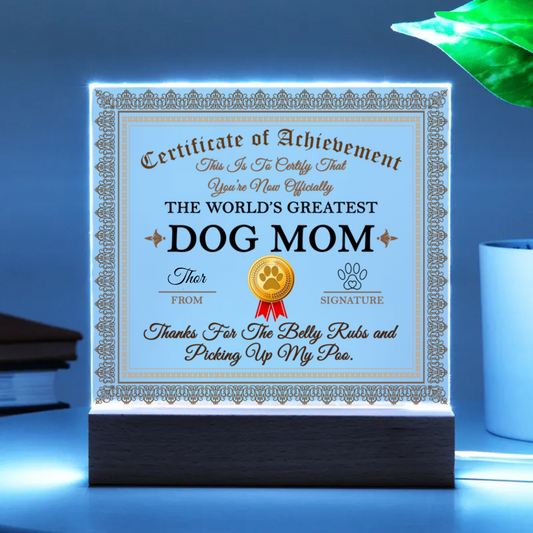 Dog Mom Certificate of Achievement Lighted Acrylic Plaque for Dog Lovers