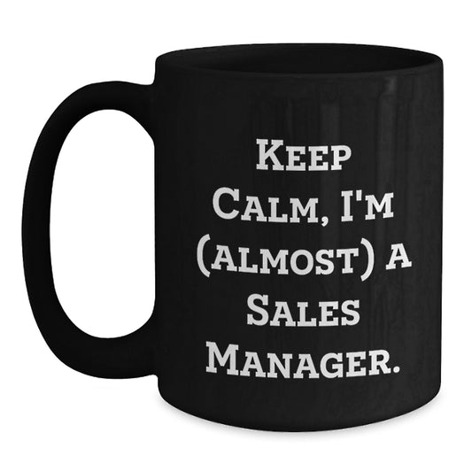 Funny Sales Manager Gifts from Friends - Keep Calm I'm (almost) A Sales Manager. Black Ceramic Coffee Mug for Birthday