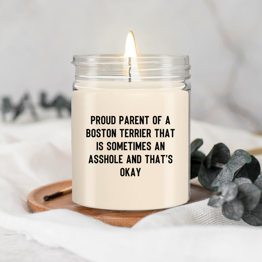 Funny Boston Terrier Candle – “Proud Parent of a Boston Terrier That Is Sometimes an A**hole and That’s Okay” – Sarcastic Dog Lover Gift for Pet Moms & Dads – 100% Soy Wax, 9 oz