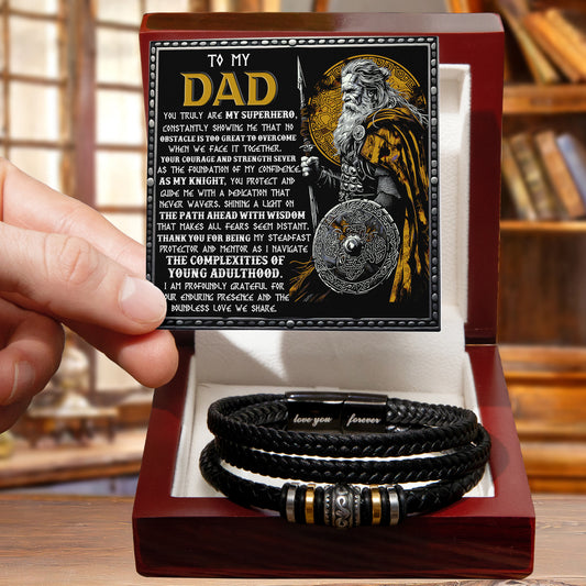 To My Dad Braided Leather Bracelet with Superhero Knight Viking Dad Message Card - Thoughtful Father's Day, Birthday Gift from Son or Daughter for Strong and Courageous Fathers
