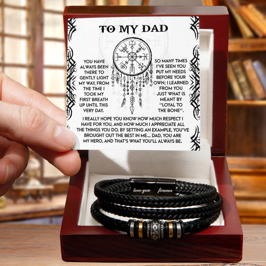 To My Dad, My Hero - Father's Day, Birthday Gift for Dad - Men's Vegan Leather Bracelet with Viking Quiet Strength Message Card