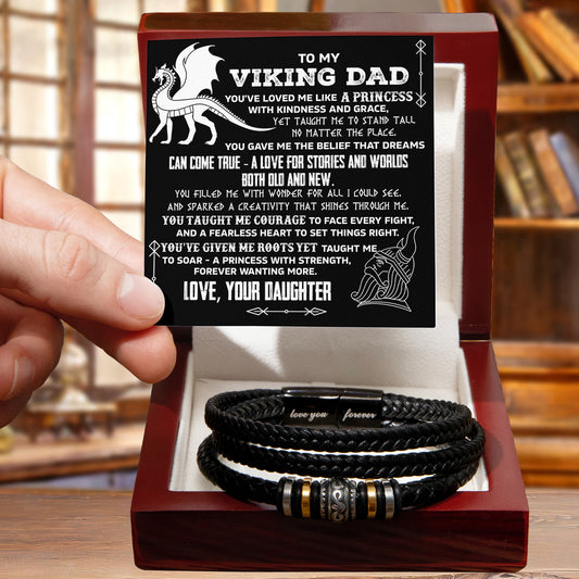 To My Viking Dad Vegan Leather Bracelet Birthday, Father's Day Gift from Daughter with Viking Dragon “Princess Strength” Message Card