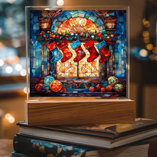 Stained Glass Christmas Stockings Acrylic Plaque with Lighted LED Wooden Base