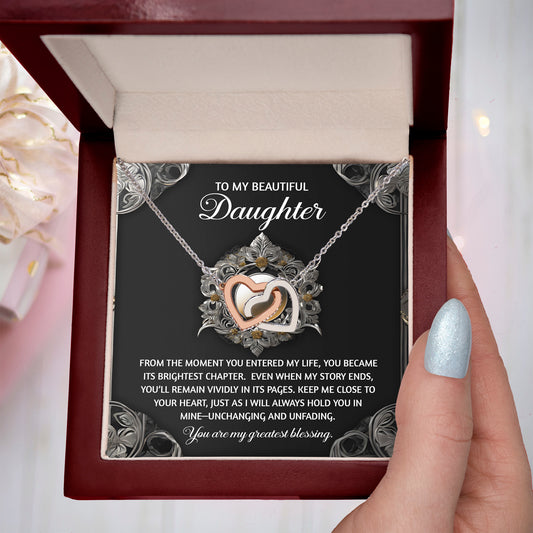 To My Beautiful Daughter - Interlocking Hearts Necklace with Sentimental Message – Birthday, Graduation, Christmas Jewelry – Luxury LED Box Option