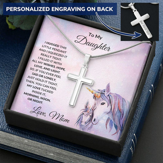 To My Daughter Engraved Cross Necklace Unicorn Message Card