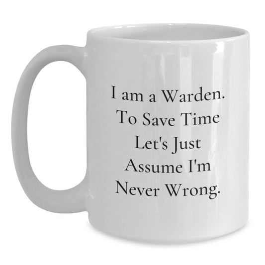 Funny Warden Gifts for Friends - Christmas Unique Gifts from Men - White Coffee Mug 'I Am A Warden. To Save Time Let's Just Assume I'm Never Wrong.'