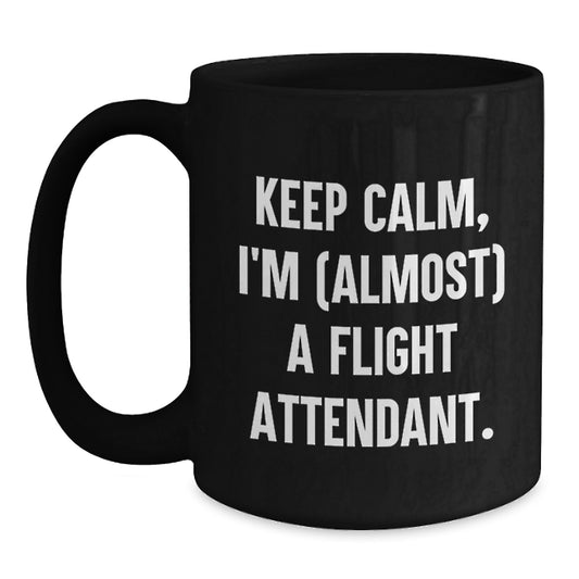 Funny Flight Attendant Gifts for Men, Women, Coworkers, or Family - 'Keep Calm, I'm (almost) A Flight Attendant.' Black Coffee Mug for Christmas Unique Gifts from Friends