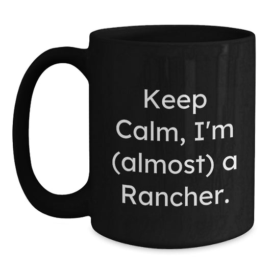 Rancher Humor Funny Quote Black Coffee Mug Gifts for Men from Friends, Christmas Unique Mugs for Rancher Enthusiast, Keep Calm I'm almost a Rancher Black 11oz or 15oz Ceramic Mugs