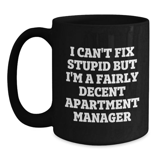 Funny Gifts from Friends to Men - 'I Can't Fix Stupid But I'm A Fairly Decent Apartment Manager' Black Coffee Mug for Apartment Managers, Christmas Unique Gifts