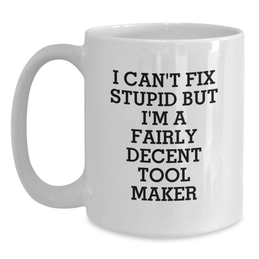 Funny Tool Maker White Coffee Mugs Gifts from Men to Friends and Family with I Can't Fix Stupid But I'm A Fairly Decent Tool Maker Quote for Christmas Unique Gifts