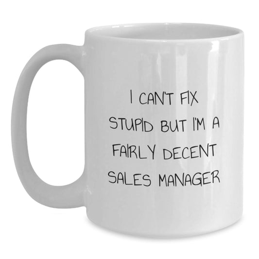 Funny Sales Manager Gifts from Friends for Christmas Unique Mug, I Can't Fix Stupid But I'm A Fairly Decent Sales Manager, White Coffee Mug Gift