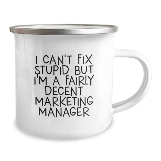 Funny Marketing Manager Gifts from Friends for Men with I Can't Fix Stupid But I'm A Fairly Decent Marketing Manager Camping Mug, Christmas Unique Gifts