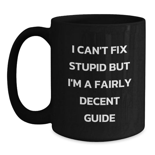Funny Guide Gifts for Guide Enthusiasts from Friends - 'I Can't Fix Stupid But I'm A Fairly Decent Guide' Black Coffee Mug for Christmas Unique Gifts