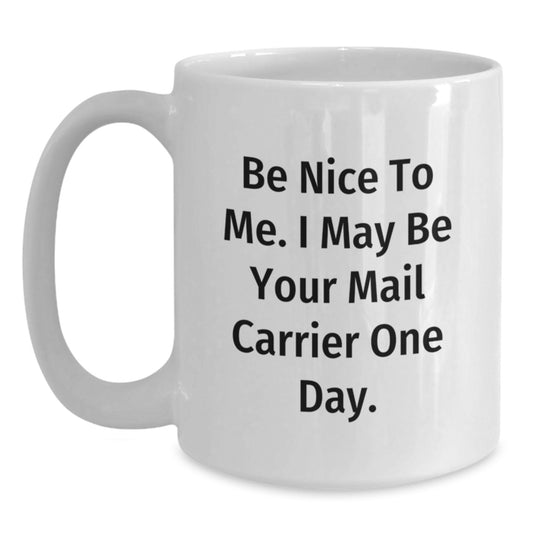 Funny Mail Carrier Gifts for Him or Her, Be Nice To Me White Coffee Mug, 11oz or 15oz Capacity, Ceramic, Microwave and Dishwasher Safe