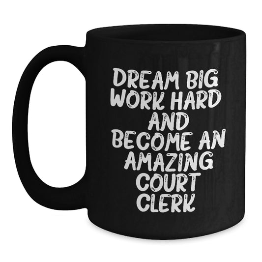 Inspirational Court Clerk Gifts for Birthday, Funny 'Dream Big, Work Hard, And Become An Amazing Court Clerk.' Quote Black Coffee Mug for Men or Women, Gifts from Family Friends Coworkers