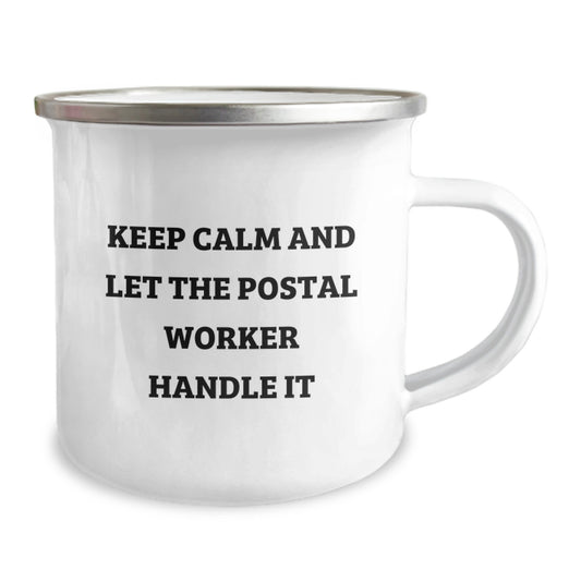 Funny Postal Worker Gifts, Keep Calm And Let The Postal Worker Handle It, 12 Oz Stainless Steel Camping Mug for Birthday Unique Gifts from Friends, Family, or Coworkers to Postal Worker