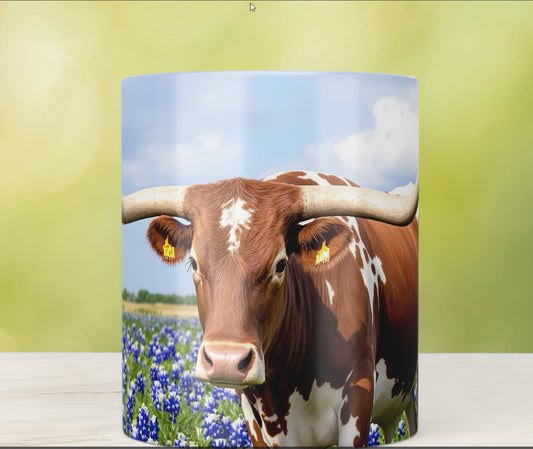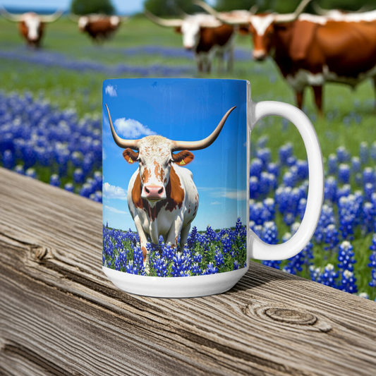Texas Longhorn in Bluebonnet Field Ceramic Mug – 11oz & 15oz Coffee Cup - Western, Ranch, and Texan Pride