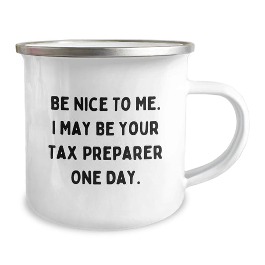Funny Tax Preparer Gifts from Friends, 'Be Nice To Me. I May Be Your Tax Preparer One Day.' Camping Mug for Birthday