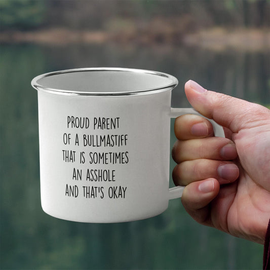 Funny Bullmastiff Parent Camping Mug – Proud Dog Owner Gift for Hikers, Campers, and Pet Lovers – 12oz Stainless Steel Enamel Travel Cup