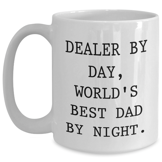 Funny Dealer Gifts, White Coffee Mug for Graduation, 'Dealer By Day, World's Best Dad By Night.' - Gifts from Family, Friends, Coworkers, or Men