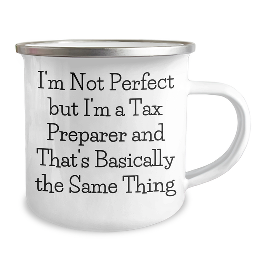 Funny Tax Preparer Gifts from Friends for Men, Women, Coworkers and Family - I'm Not Perfect But I'm A Tax Preparer And That's Basically The Same Thing Camping Mug