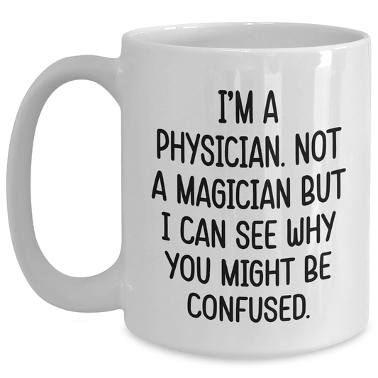 Funny Physicians Gifts for Men - White Coffee Mug with 'I'm A Physician. Not A Magician...' Quote, Gifts from Family, Unique Father's Day Unique Gifts