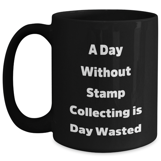 Funny Stamp Collecting Quotes, 'A Day Without Stamp Collecting Is Day Wasted', Black Coffee Mug, Ideal Gift from Family to Stamp Collecting Enthusiasts on Father's Day