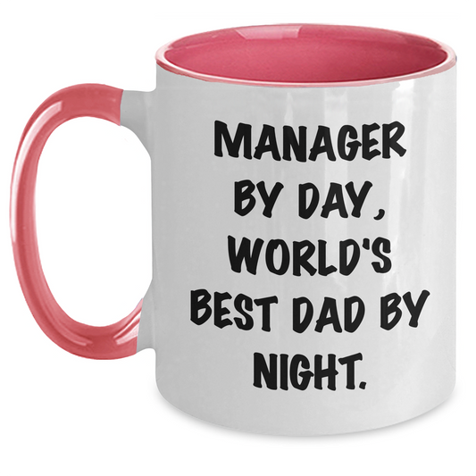 Funny Manager Quote Two Tone Coffee Mug, Gifts from Men for Manager By Day, World's Best Dad By Night. on Father's Day