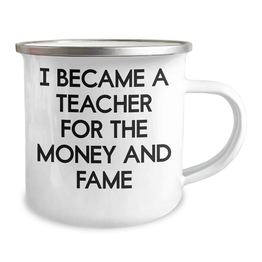 Funny Teacher Enamel Camping Mug – 12oz Stainless Steel Cup – “I Became a Teacher for the Money and Fame” – Gag Gift for Educators, Professors, School Staff