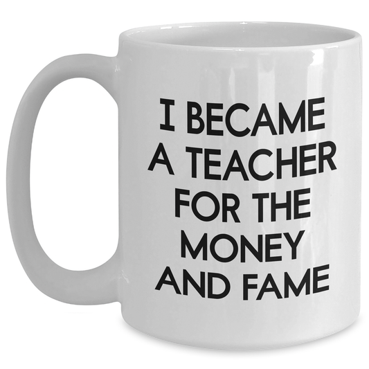 Teacher Humor Gifts from Friends for Mother's Day - 'I Became A Teacher For The Money And Fame' White Coffee Mug, 11oz or 15oz, Ceramic, Microwave and Dishwasher Safe