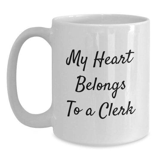 Funny Clerk Gifts from Friends, 'My Heart Belongs To A Clerk' White Coffee Mug, Perfect Graduation Unique Gifts for Clerk