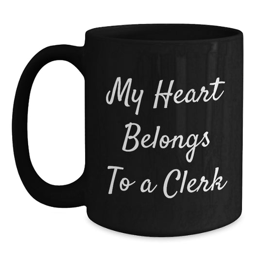 Funny Clerk Gifts, My Heart Belongs To A Clerk, Black Coffee Mug for Graduation, From Friends to Coworkers
