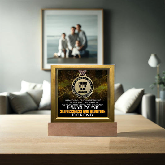 Father of the Year Award Acrylic Plaque with LED Light Base – Funny Best Dad Ever Gift from Kids – Selflessness and Devotion Tribute – Father's Day Display Sign – USB or Battery Option