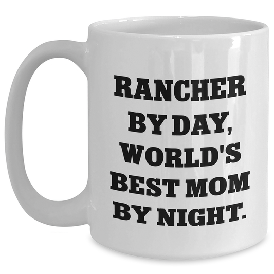 Rancher's Daily Grind, World's Best Mom's Nighttime Delight, Funny White Coffee Mug Gifts from Family to Rancher Mom on Mother's Day