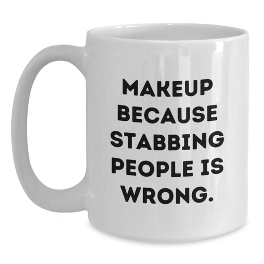 Funny Makeup Gift for Women Black Coffee Mug, Quote: 'Makeup Because Stabbing People Is Wrong.' Christmas Unique Gifts from Friends to Family