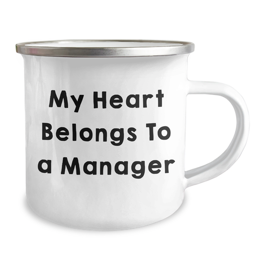 Manager's Heart Belongs to Camping Mugs, Funny Gift from Friends to Boss on Graduation, 12 oz Stainless Steel with Enamel Finish