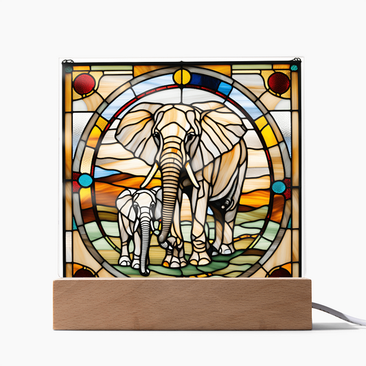 Elephant Mother and Baby Calf - Stained Glass Style LED Acrylic Plaque – A Symbol of Strength, Love, and Family