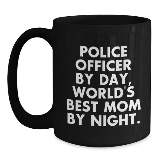 Police Officer Gifts from Mom, Funny Quote, Black Coffee Mug for Graduation - 'Police Officer By Day, World's Best Mom By Night.'