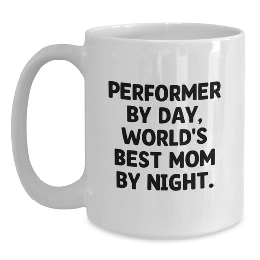 Funny Performer Gifts from Mom - White Coffee Mug for Graduation, Gifts for Men, Women, Friends, Coworkers, Family - 'Performer By Day, World's Best Mom By Night.'
