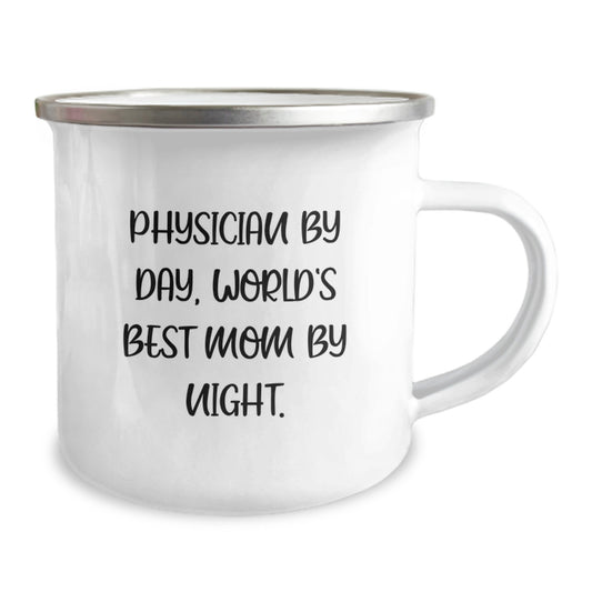 Physician Gifts from Mom - Funny Camping Mug for Graduation 'By Day, World's Best Mom By Night' Quotes, 12 oz Stainless Steel with Enamel Finish