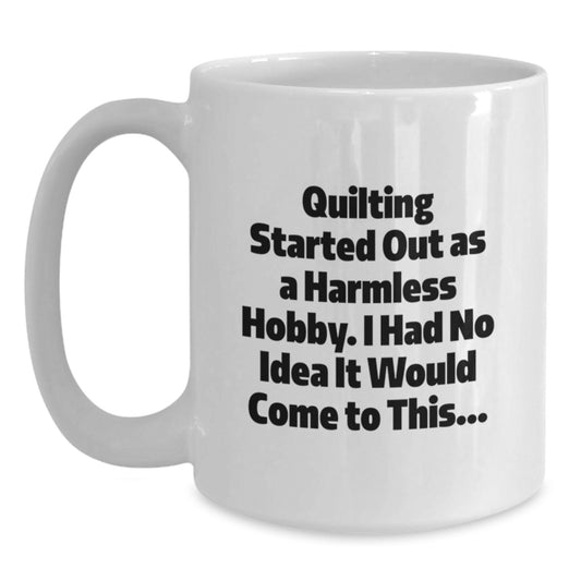 Quilting Gifts from Family to Friends - Funny White Coffee Mug for Graduation 'Quilting Started Out As A Harmless Hobby...'Regular price From $21.95 USDRegular priceUnit price / per$43.95 USDSale price From $21.95 USDSale