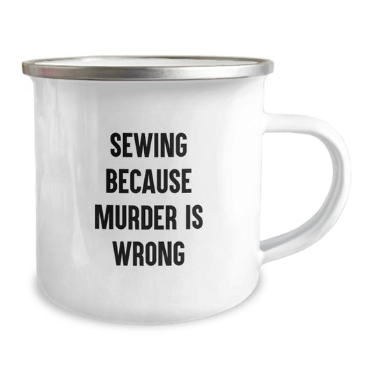 Sewing Enthusiasts Gifts from Mom to Sewing Graduates Funny Camping Mug, Inspirational Quote 'Sewing Because Murder Is Wrong', 12 oz Stainless Steel with Enamel Finish