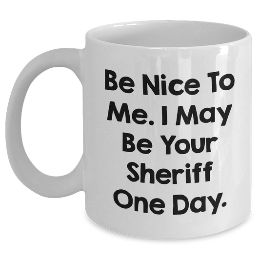 Funny Sheriff Gifts from Mom to Sheriff on Mother's Day - Be Nice To Me. I May Be Your Sheriff One Day. White Coffee Mug, 11oz or 15oz, Ceramic, Microwave, and Dishwasher Safe
