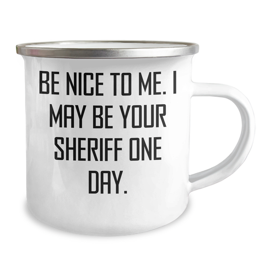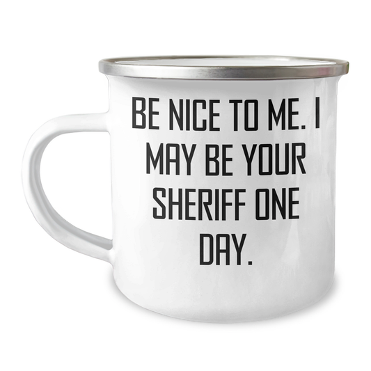 Funny Sheriff Camping Mug Gifts for Mom on Mother's Day - 'Be Nice To Me' Quote, 12 oz Stainless Steel Enamel Finish, Gifts from Family to Sheriff