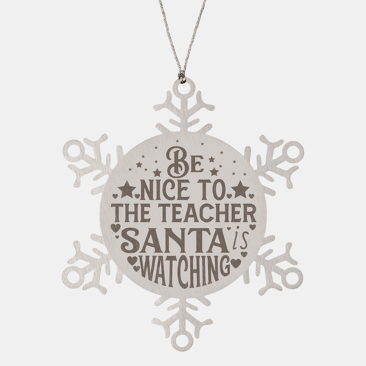 Teacher Gift, Be Nice to the Teacher, Santa is Watching, Snowflake Laser Engraved Steel Christmas Ornament, Funny Gifts, Novelty Gifts for Men, Women, Coworkers, Keepsake Teacher Ornament