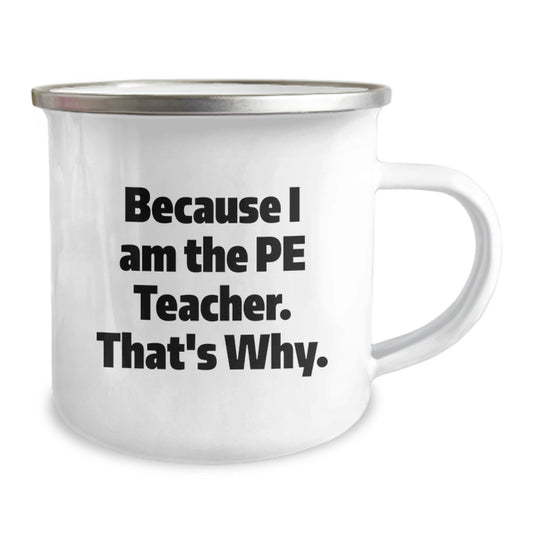 PE Teacher Humor Gifts from Friends, Unique Graduation Mugs for Men, Funny Because I Am The PE Teacher. That's Why., 12 oz Camping Mug