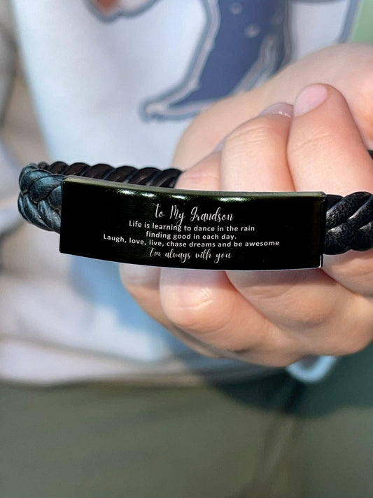 Inspirational Grandson Braided Leather Engraved Bracelet - Behind you, all your Memories
