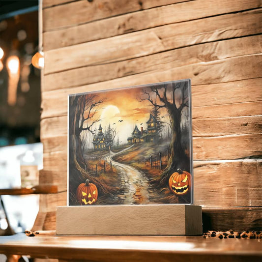 Bewitched Abode: The Ultimate Halloween Mansion Acrylic Plaque with Lighted LED Wooden Base