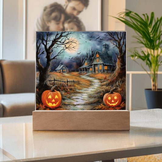 Ghostly Manor: Halloween Acrylic Square Plaque with LED Lighted Wooden Base